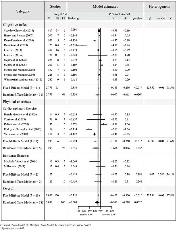 Objectives: To summarize the evidence of phasic HRV responses to cognitive and physical exercises, and to evaluate key moderating factors influencing these responses.